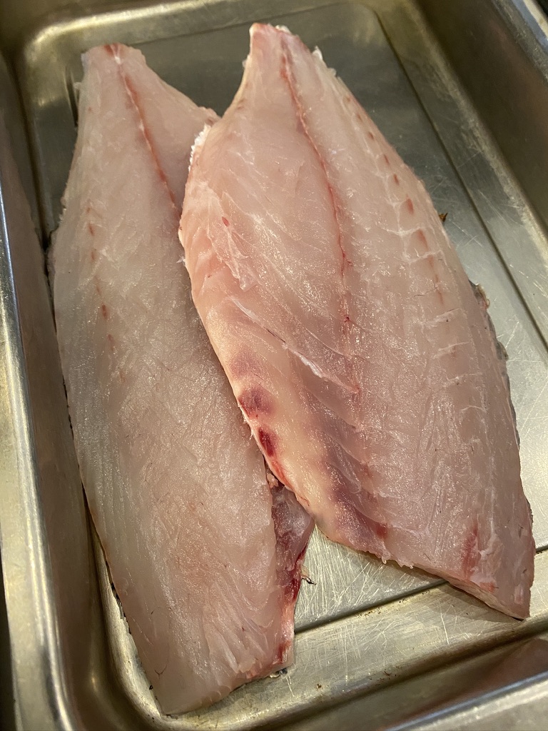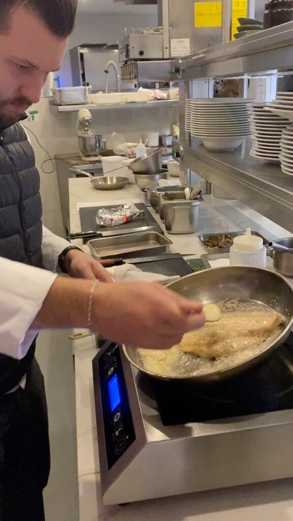 Then it was time to pan fry the fillets. The secret is to put the fillet skin side down in the frying pan (in neutral oil) and then add butter. When the butter melts you tip the frying pan a bit and rapidly baste the top. You don’t flip the fillet — the heat from the butter/oil cooks the delicate fish through.