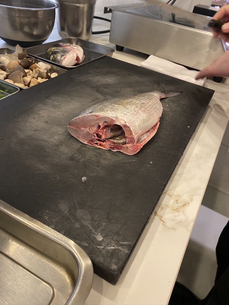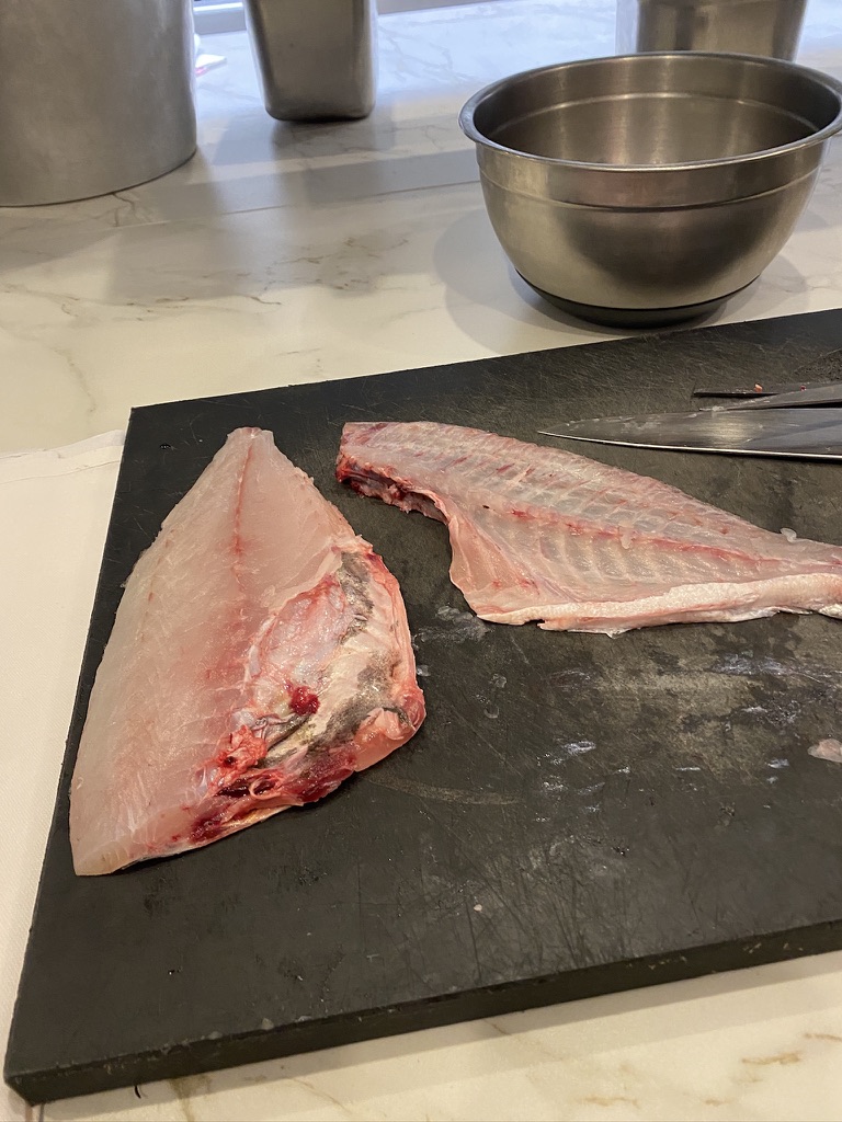 Brasserie François has a semi-open kitchen and as Sebastian and I were enjoying the terrine, I noticed François putting out two cutting boards and various knives and tools. He put the Daurade Royale on one of the cutting boards. He then motioned for me to come into the kitchen. He handed me an apron and showed me my cooking station. Until this point, I thought I’d be watching him cook.