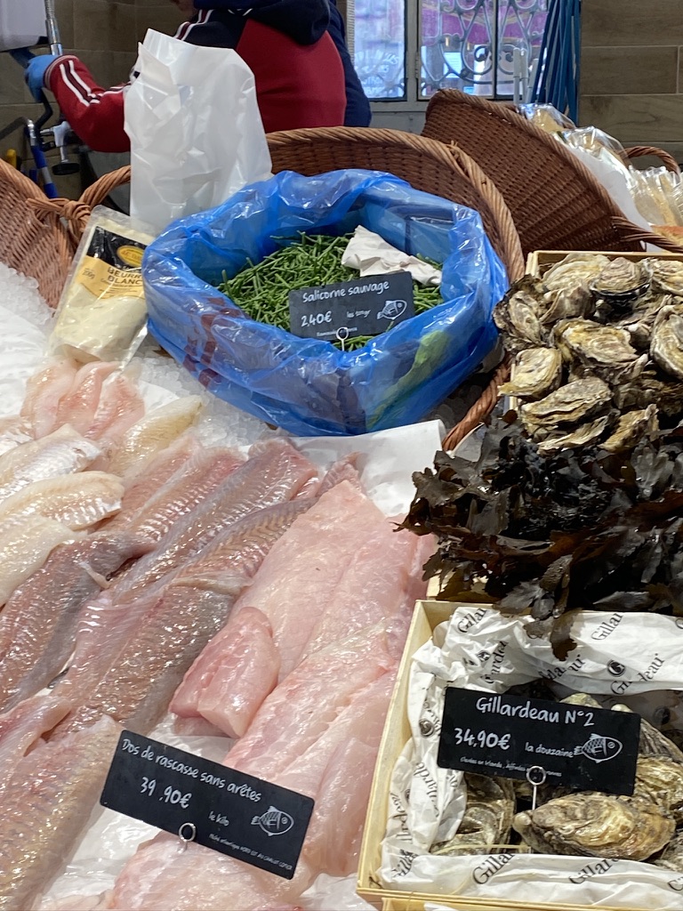 I was surprised to see among the fish a basket marked Salicorne Sauvage. I told François I used to buy that when I lived in Holland, but that I know it as sea asparagus. He asked if I like it and when I said I did he told me to bag some to serve with the daurade.