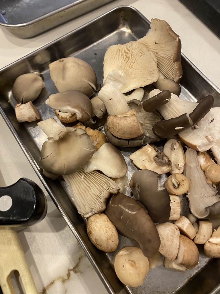 Then he was looking for what to make to accompany the fish. As we walked around, I pointed to a mushroom vendor’s stand and commented about all the different mushrooms — most of which I’d never seen. He asked if I like mushrooms. I do. He chatted briefly with the vendor and next thing I know we had a small bag of mixed mushrooms and the ingredients for our dish was coming together.
