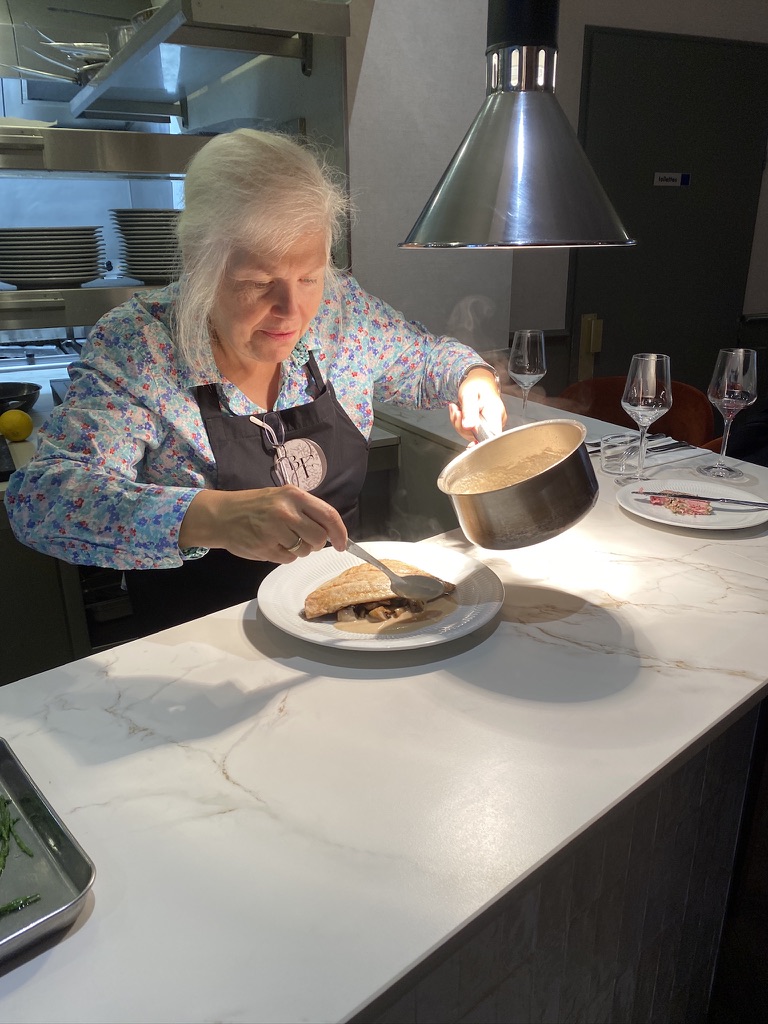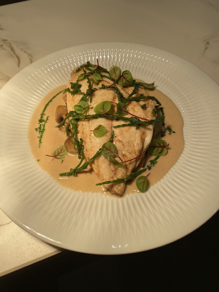 First on the plate was a mound of mushrooms. Then the fillet was centred on top. Then the sauce, which is carefully, but generously, spooned along the sides of the fillet (not on top!). The final touch was a sprinkling of gorgeous microgreens and the sea asparagus. One last thing before digging in — a glass of Saint-Romain Clos Sous Le Chateau Monopole 2022.